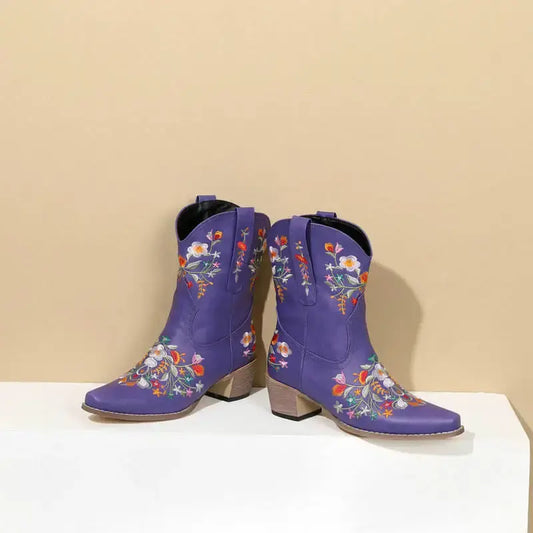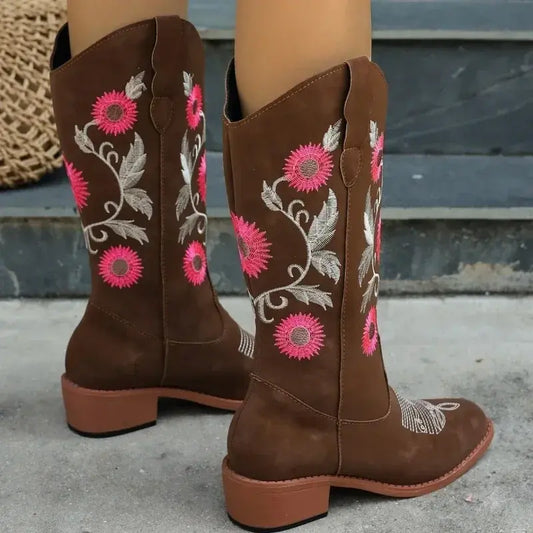 Women Embroidered Slip On Cowgirl Boots Chunky Heels