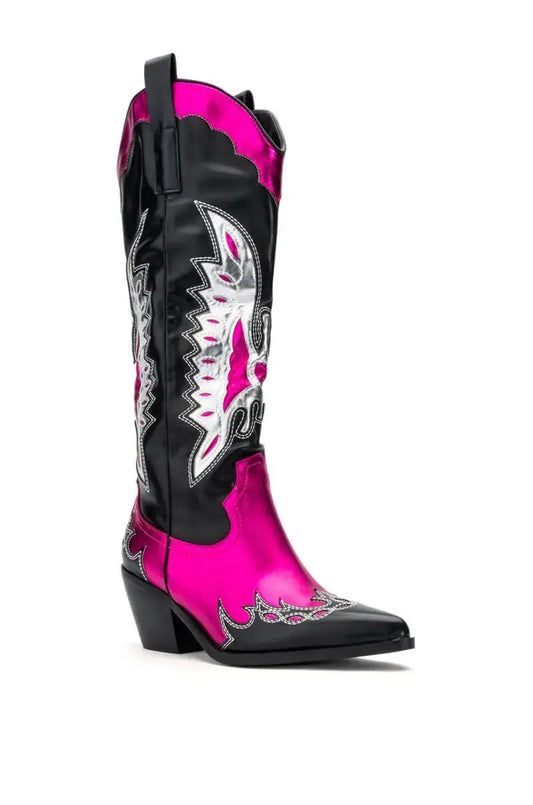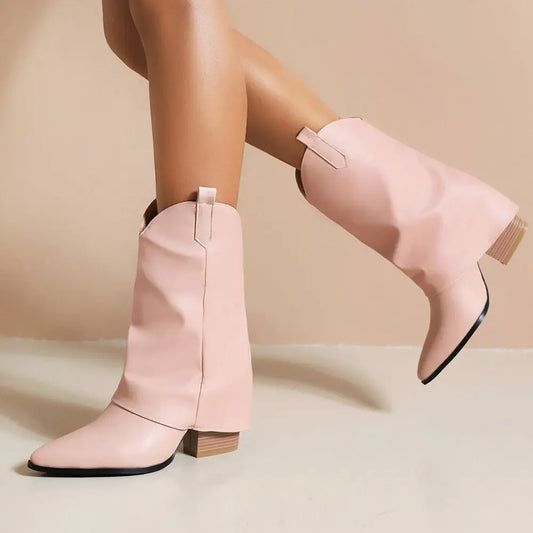 Wide Calf Western Pointed Toe Leather Patchwork Mid Calf Boot
