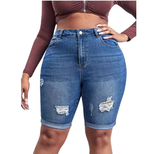 Plus Size Women's Ripped Denim Shorts with Roll Hem