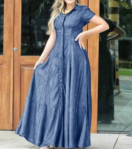 Plus Size Button Front Elastic Waist Long Sleeve Dress