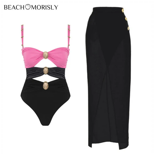 Color Block Women Swimsuit and Sarong Two-piece Set