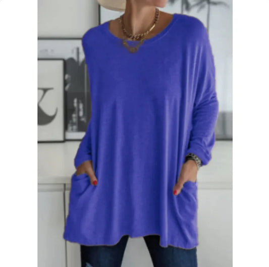 European & American Loose Fit Long Sleeve Round Neck Top with Pockets