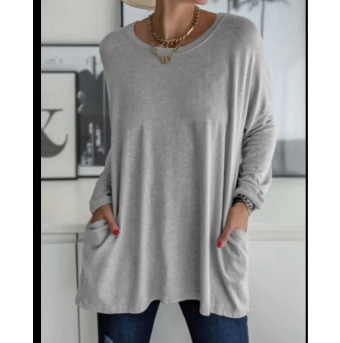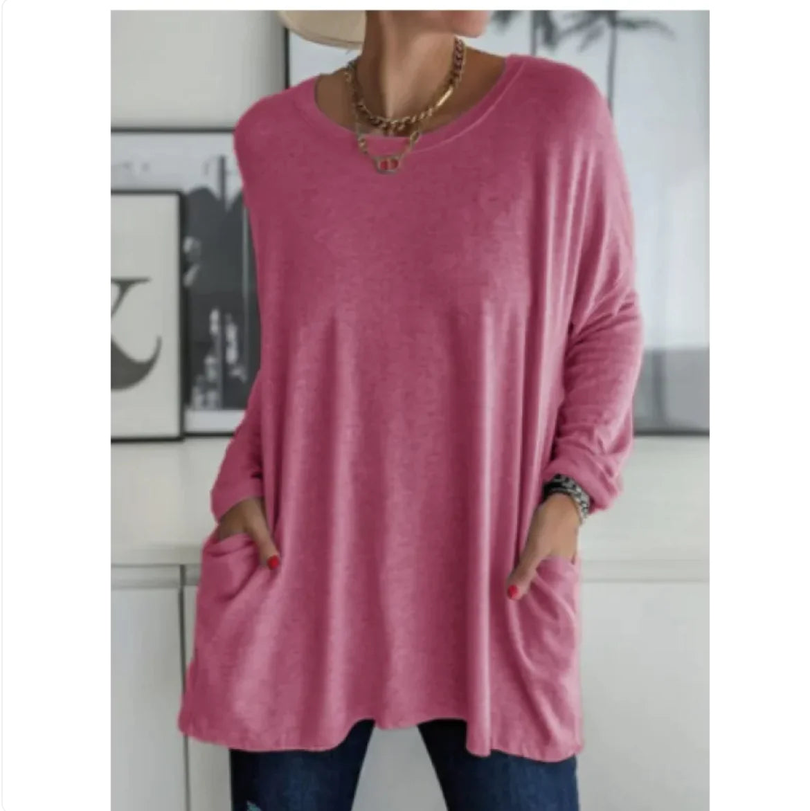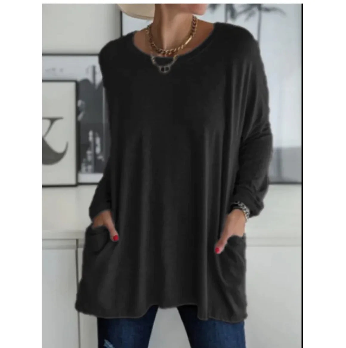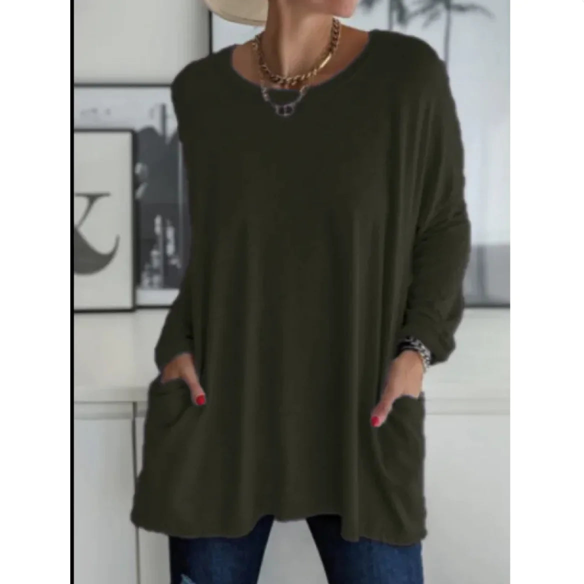 A stylish and comfortable long sleeve top featuring a round neck design and a loose fit. This solid color top is perfect for casual wear, with convenient pockets adding both functionality and style. Ideal for a relaxed yet chic look, suitable for any season.