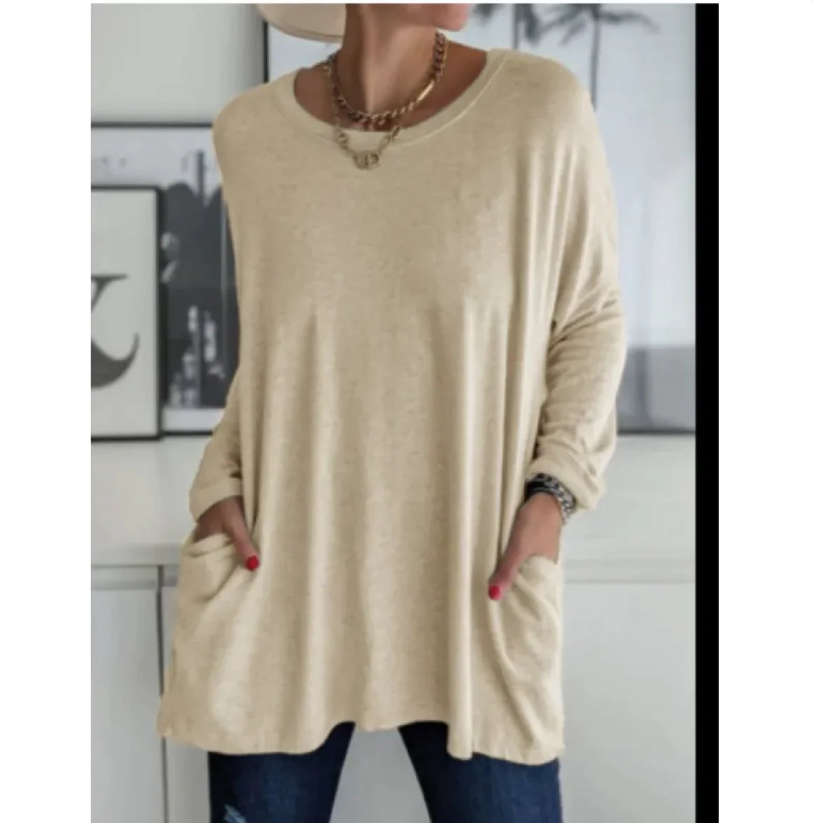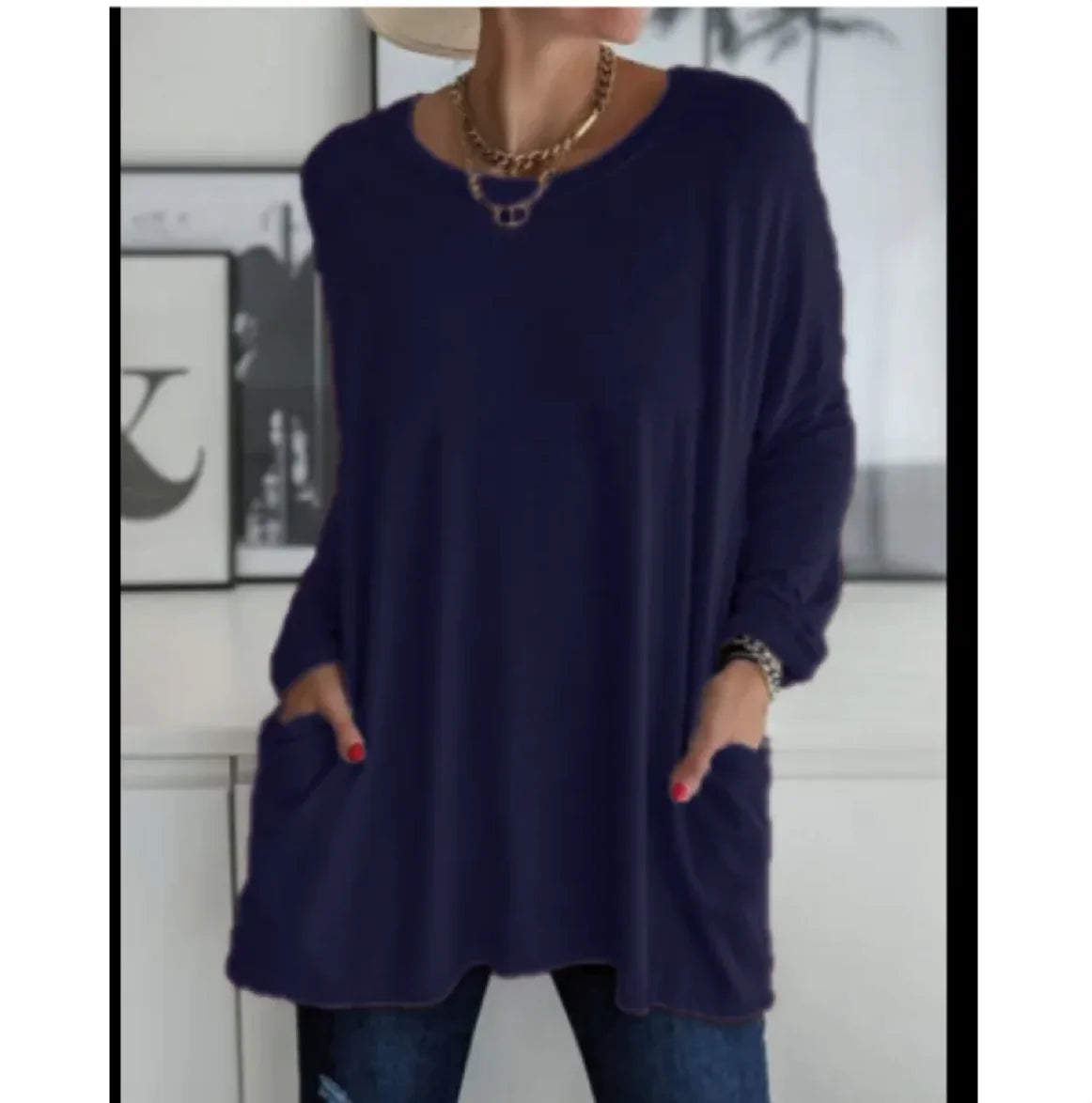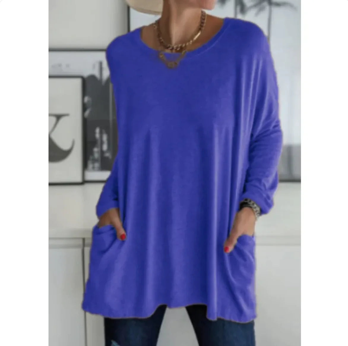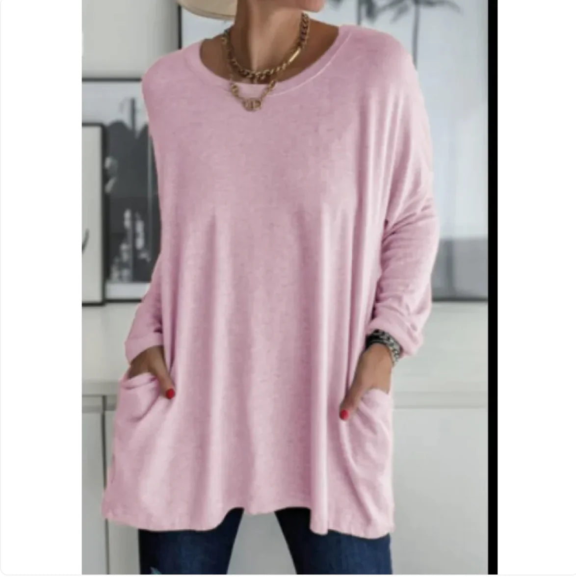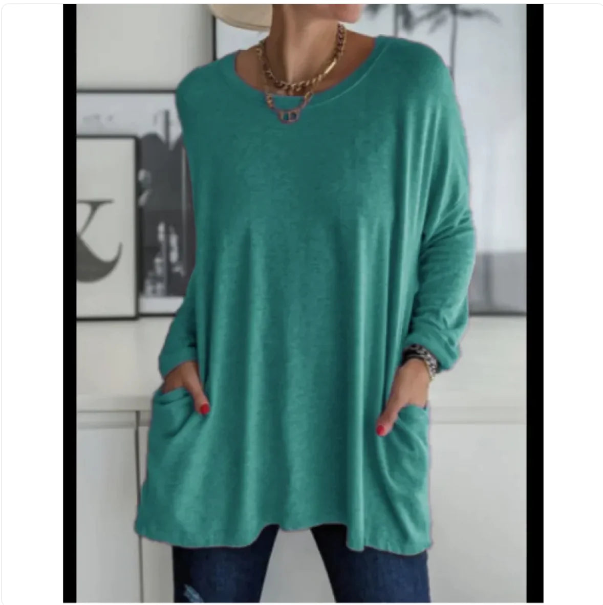 A stylish and comfortable long sleeve top featuring a round neck design and a loose fit. This solid color top is perfect for casual wear, with convenient pockets adding both functionality and style. Ideal for a relaxed yet chic look, suitable for any season.