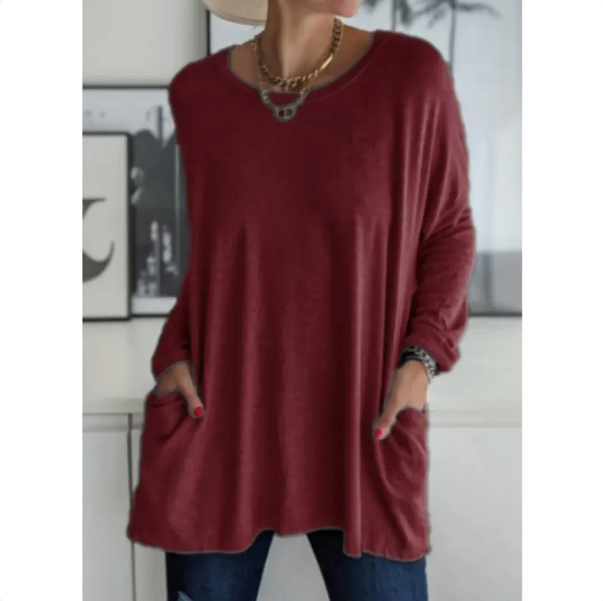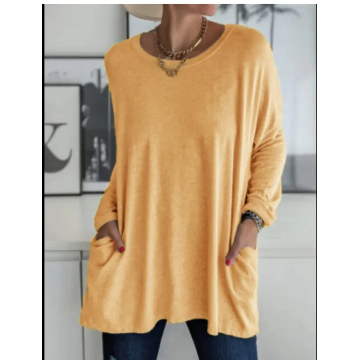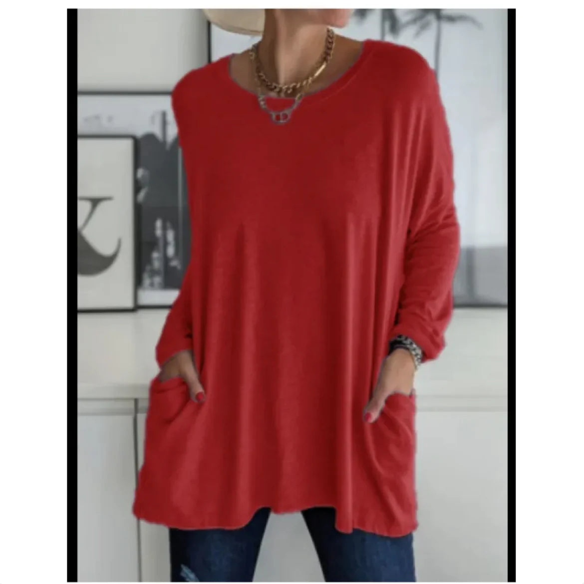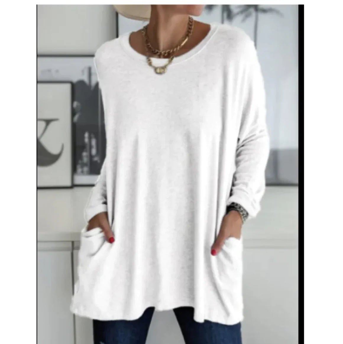 A stylish and comfortable long sleeve top featuring a round neck design and a loose fit. This solid color top is perfect for casual wear, with convenient pockets adding both functionality and style. Ideal for a relaxed yet chic look, suitable for any season.