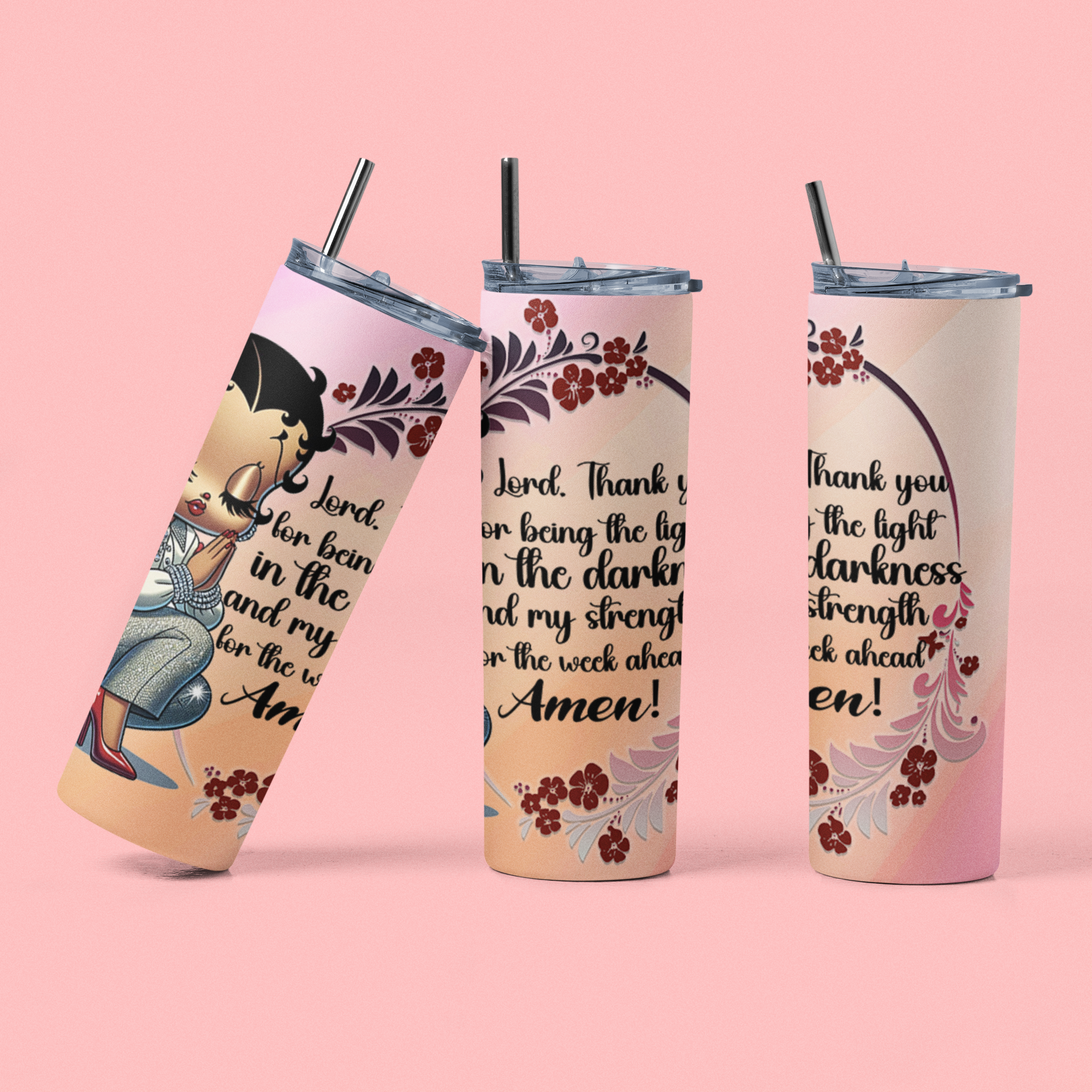 Start your day with faith and style! This 20oz skinny tumbler features Betty Boop in prayer with the uplifting message: “Lord, Thank you for being the light in the darkness and my strength for the week ahead. Amen!!” Perfect for coffee, tea, or cold drinks, it’s an ideal gift for Betty Boop fans and anyone who draws strength from their faith. Durable, insulated, and ready to inspire!