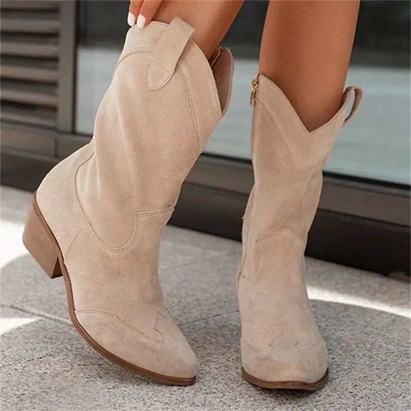 Discover timeless charm with our Mid-Calf Ethnic Female Western Boots, designed to captivate with their unique blend of western-inspired aesthetics and ethnic detailing. Crafted with precision and style in mind, these boots boast a mid-calf height that adds a touch of allure to any outfit. The ethnic motifs and embellishments infuse these boots with a sense of cultural richness, while the sturdy construction ensures durability and comfort. Whether you're strolling through city streets or embracing the great outdoors, these boots are the perfect companion for the modern woman seeking both style and substance. Elevate your footwear collection with our Mid-Calf Ethnic Female Western Boots and step confidently into each new adventure.