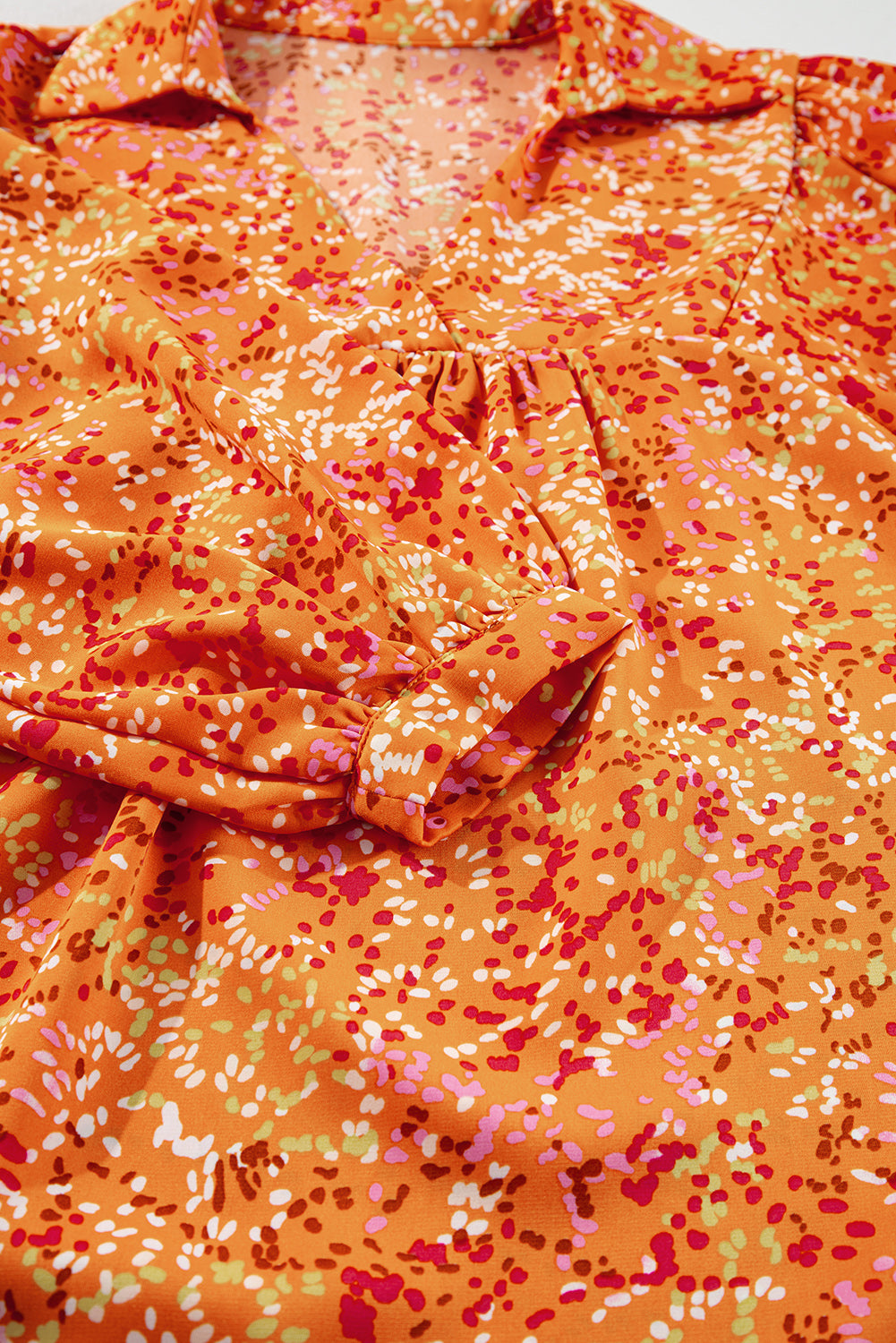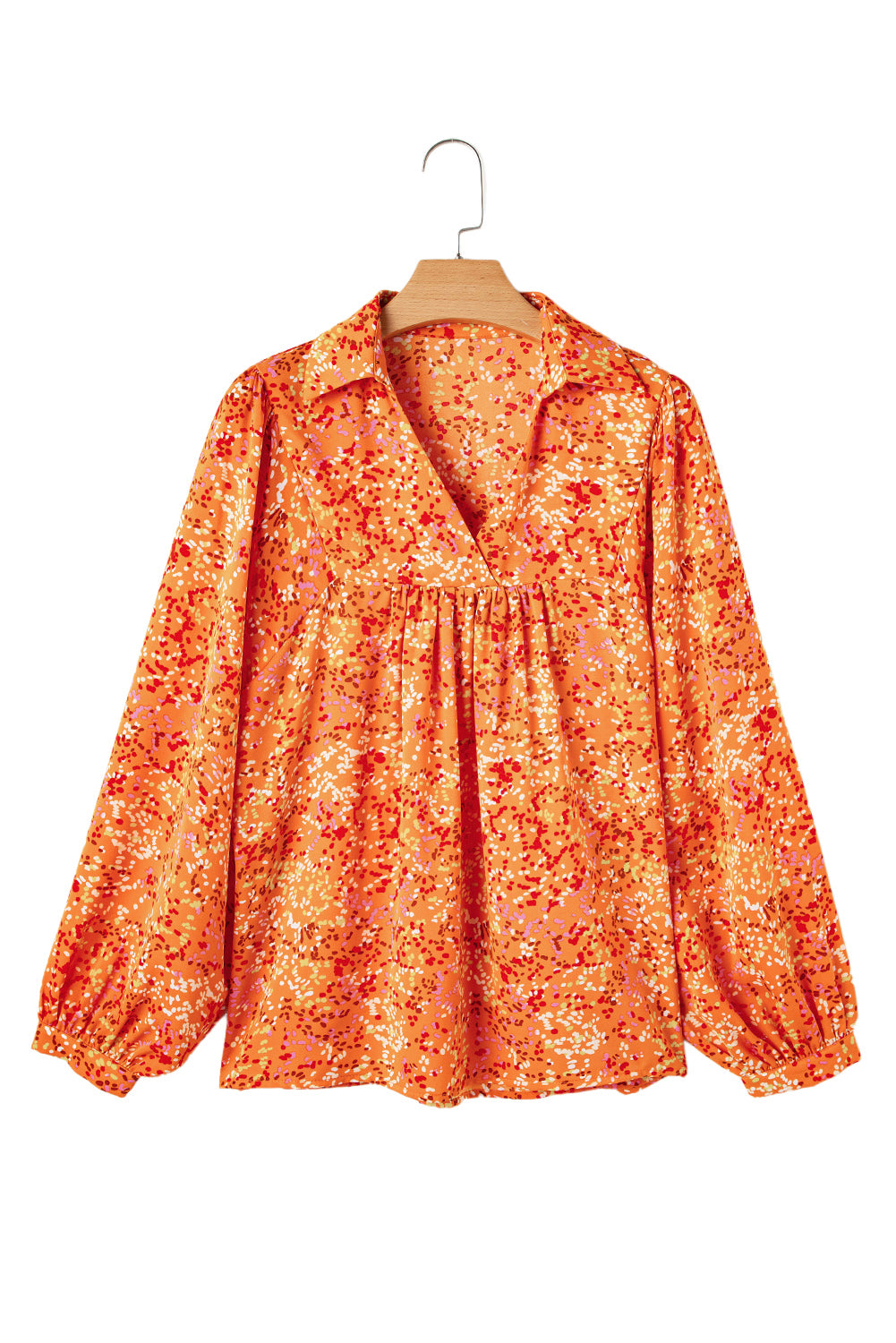 Orange Abstract Print Loose Fit Collared V Neck Babydoll Blouse