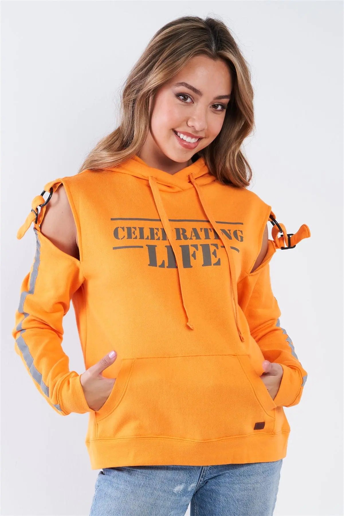 Orange Long Sleeve Adjustable Buckle Cold Shoulder "Celebrating Life" Hoodie