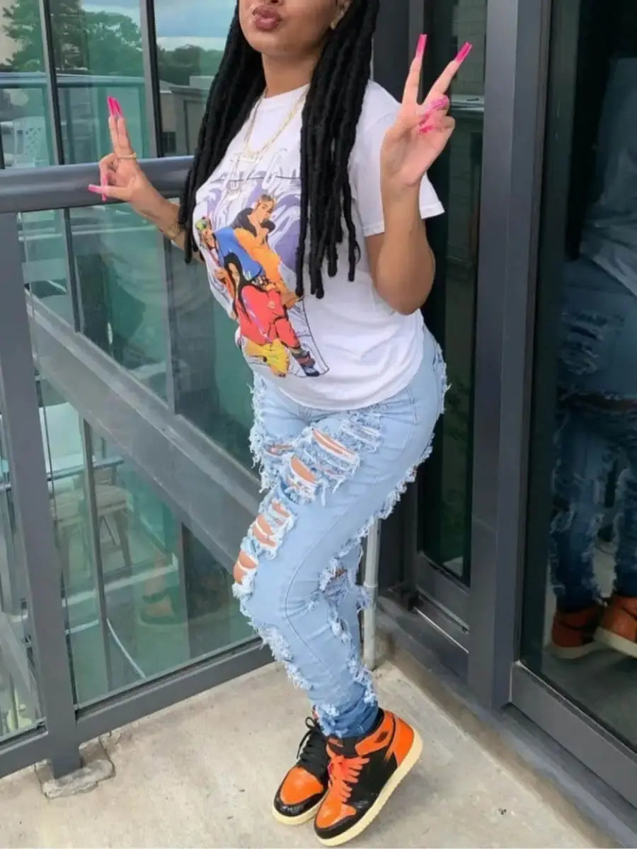 Plus Size Skinny High Waist Street Hipsters Ripped Baby Blue Stretchy Denim Jeans
