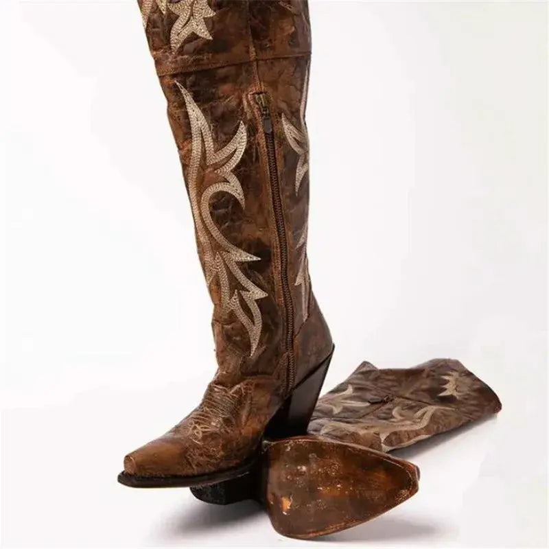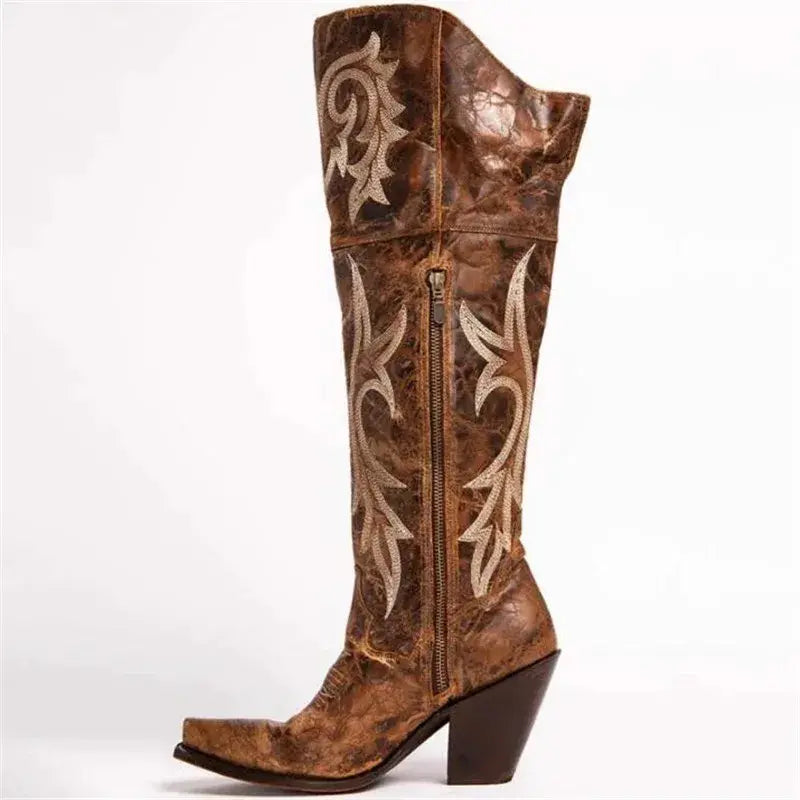 These boots are designed to keep you stylishly warm during the chilly months while making a bold fashion statement. With their knee-high silhouette, thick high heels, and vintage-inspired design, these boots are the epitome of elegance and charm.