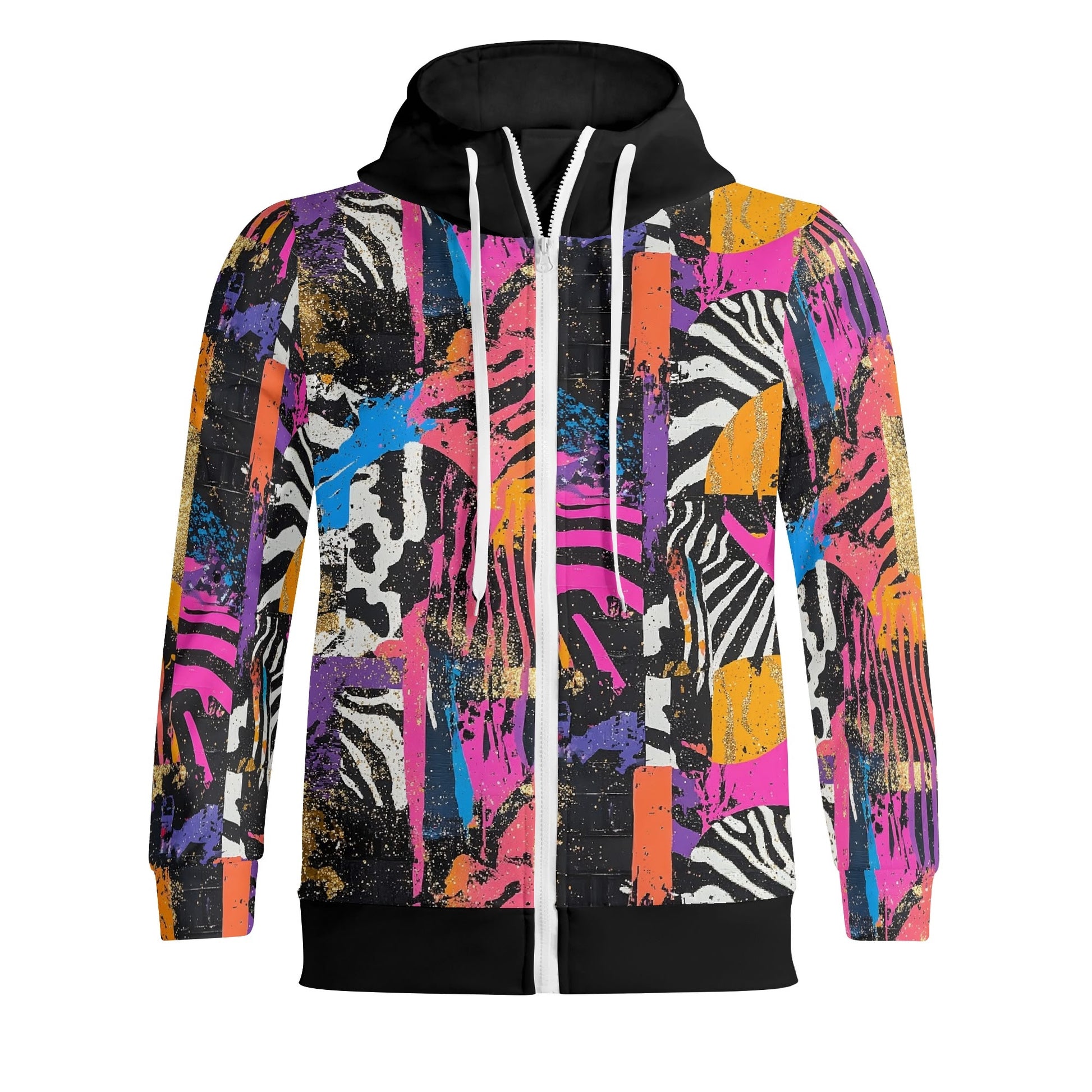 Make a fearless fashion statement with the Retro Wild Turtleneck Full Zip Hoodie – a bold blend of retro colors, animal prints, and street-ready edge. Featuring an all-over abstract design with zebra stripes, splashes of gold, hot pink, and electric blue, this colorful turtleneck hoodie is made to stand out in any crowd.
