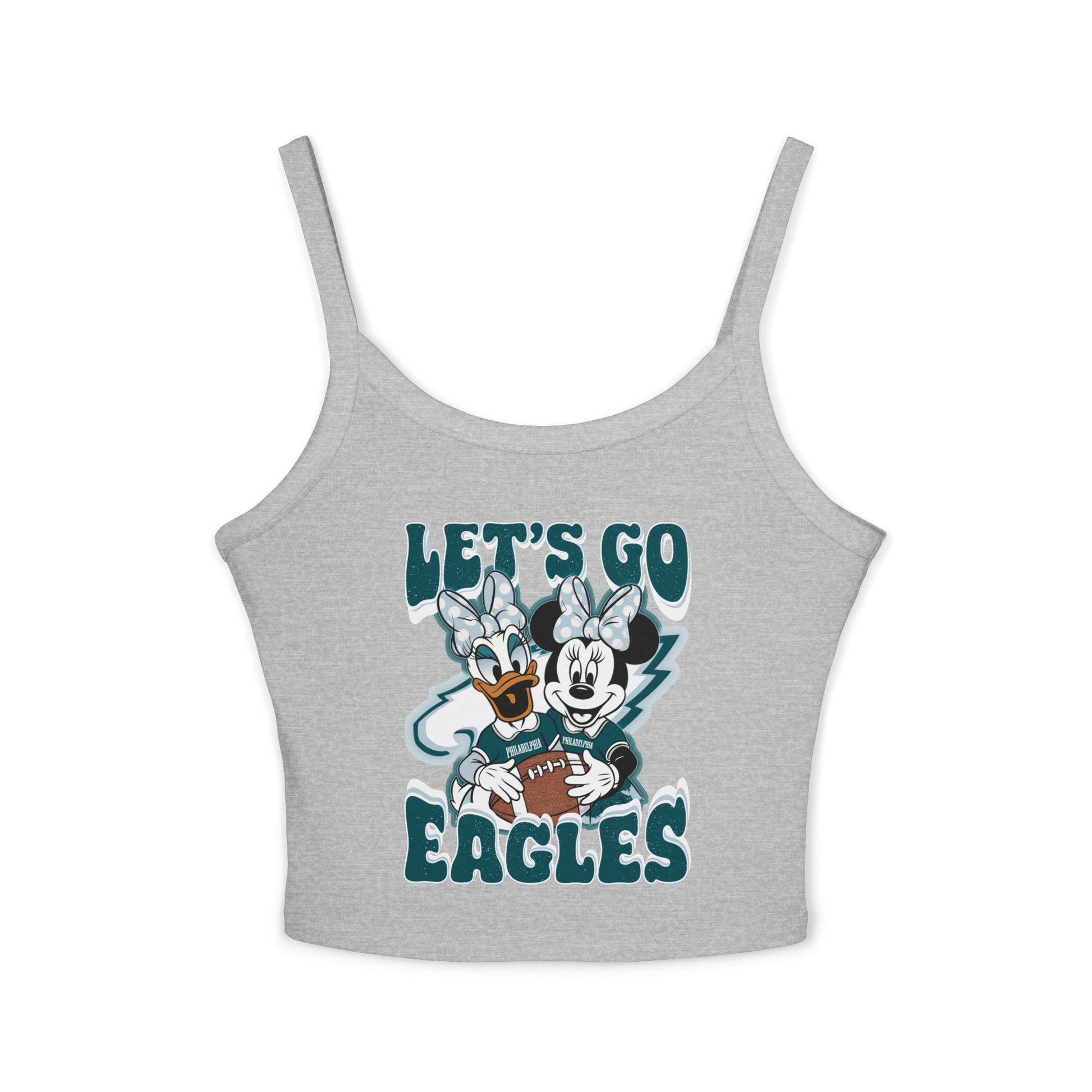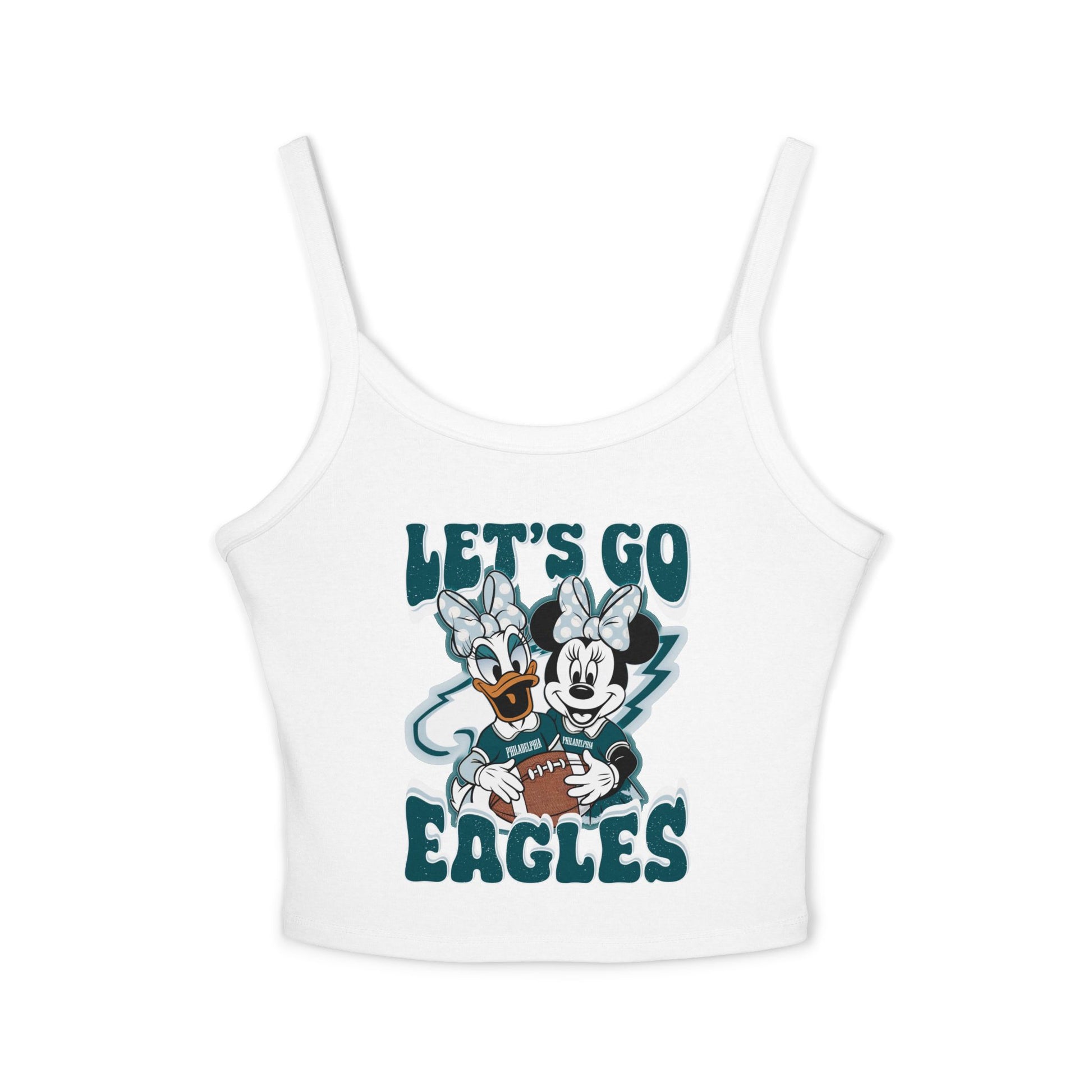 A Womens Spaghetti Strap Tank Top featuring a 'Lets go eagles' design. This tank top offers a perfect balance between coverage and mobility, making it suitable for various activities. The fabric is soft and luxurious, perfect for printing. Ideal for adults and relevant for casual wear or sports activities.
